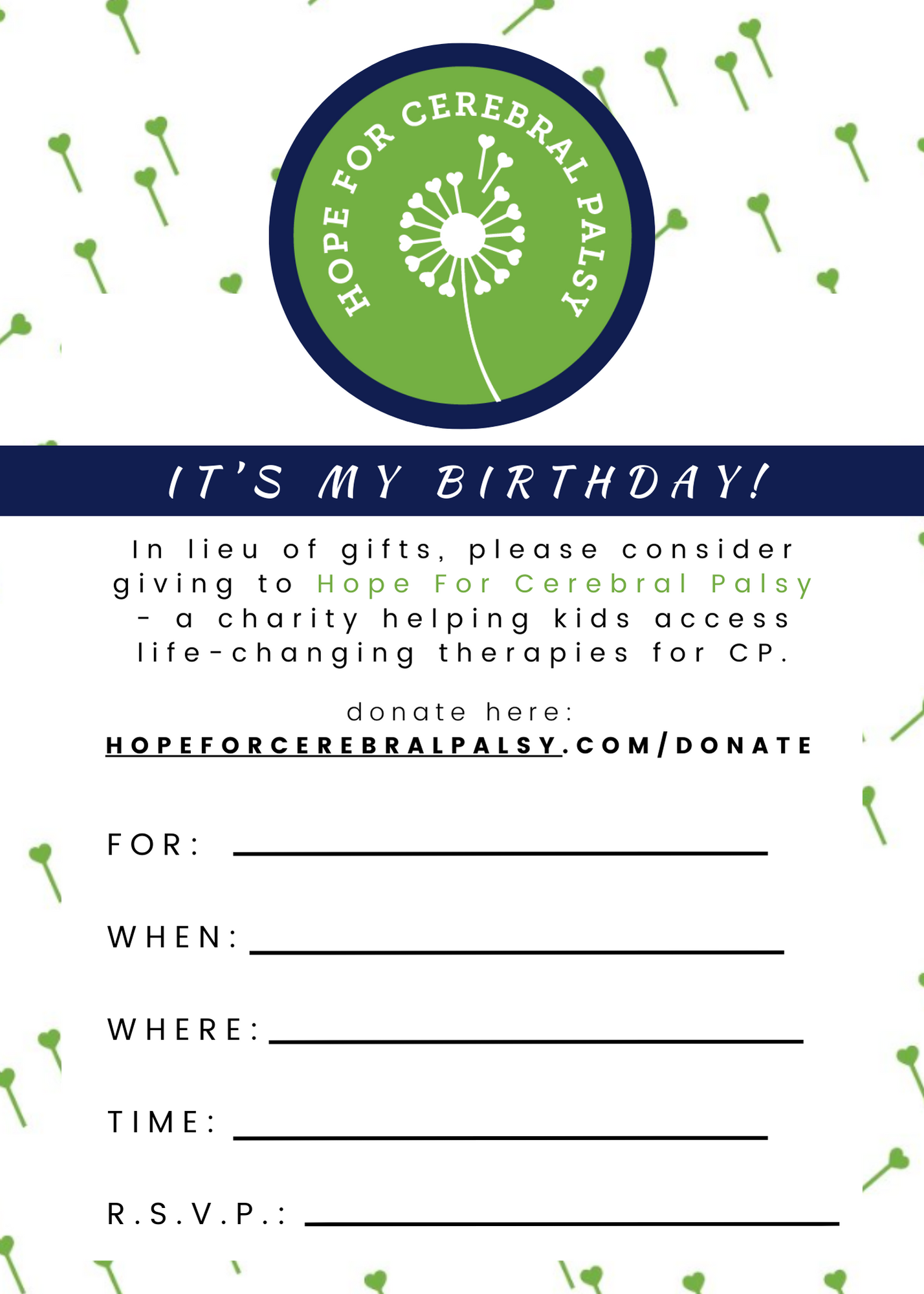 Be a BIRTHDAY WARRIOR! In lieu of gifts, ask your guests to consider donating to Hope For Cerebral Palsy and you could be featured on our social media and website… Like THESE WARRIORS!